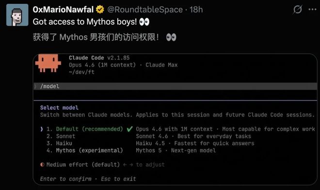 在Claude Code终端里,Mythos 5更是被直接冠以「下一代模型」的称号。