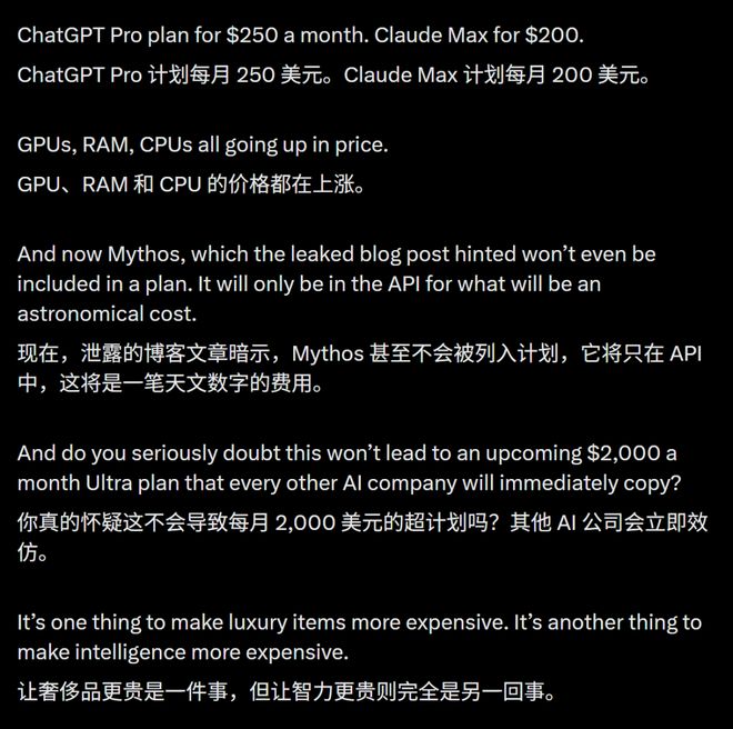 看看现在的账单吧:ChatGPT Pro涨到了250美元,Claude Max也站稳了200 美元。更高端的 Mythos甚至传闻将只开放极其昂贵的API接口。