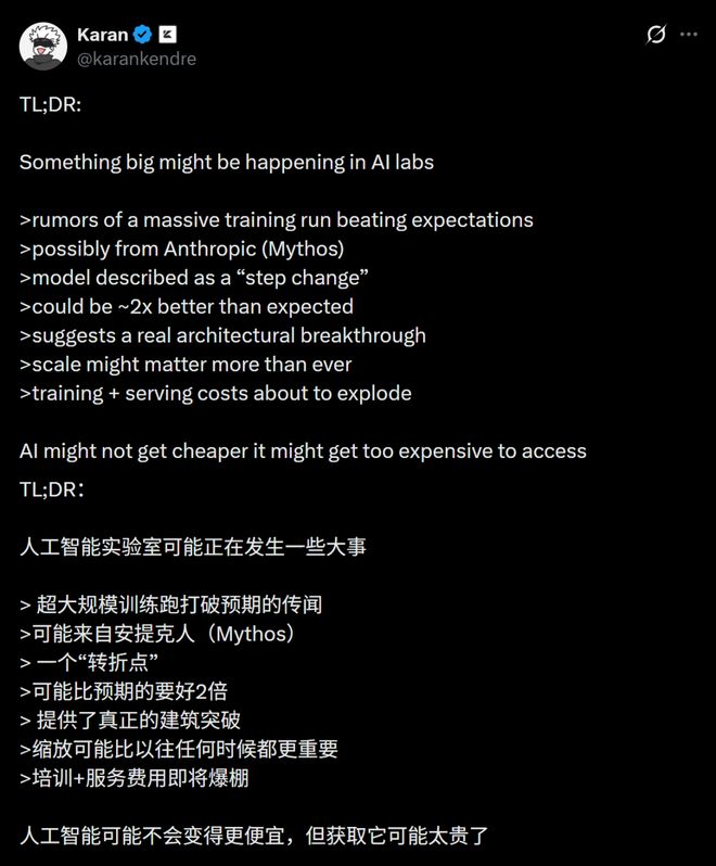 但现在随着Claude Mythos泄露稿的流出,真相越来越残酷了:前沿智能非但没有平民化,反而正在奢侈品化。