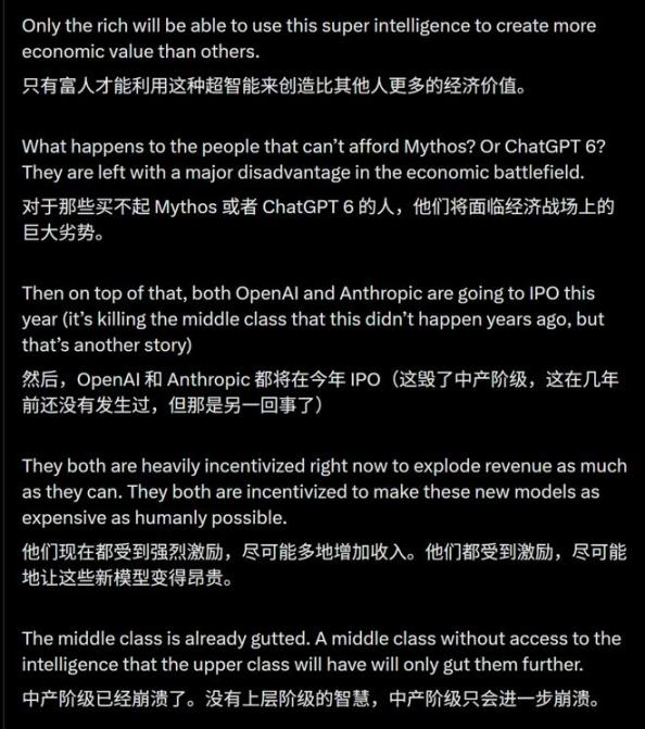 Creator Buddy的创始人Alex Finn也发表了一条X,表示Mythos的发布让自己极其紧张,因为这将导致财富差距爆棚!