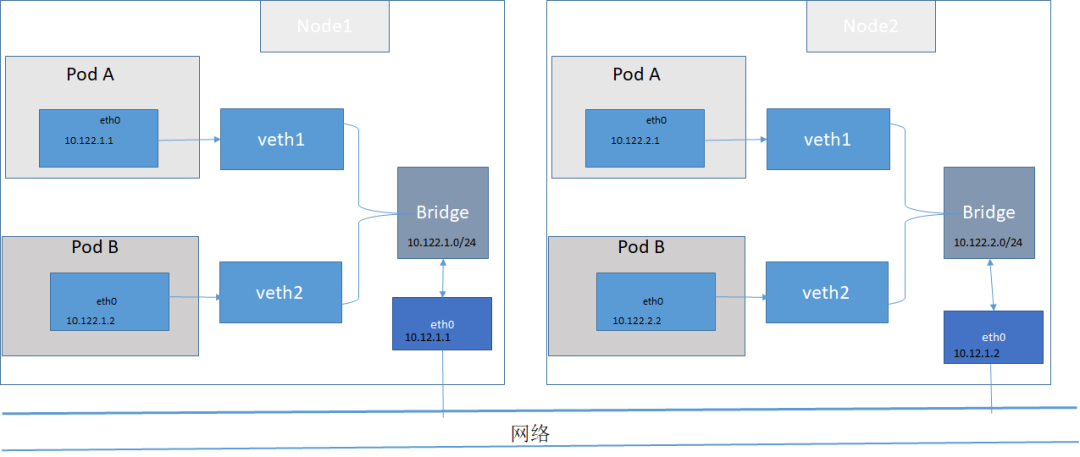 docker 在默认网络设置情况下,节点A 的docker0 跟节点B 的docker0 没有任何关联,网络也是不通的,这就导致不能满足我们跨节点通信要求。Kubernetes 的 Pod 又是通过何种方式实现的呢?