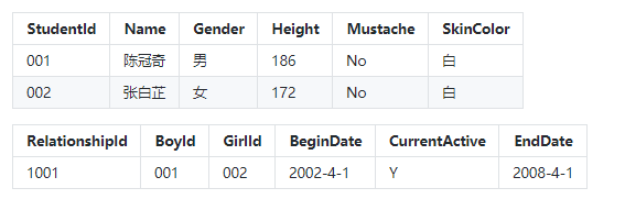 这里用到的花名册,恋爱关系秘本就是数据库里的二维表。先建这两张表,分别是 Students(花名册表),Relationships(恋爱关系秘本)。为了更加形象,用 Excel 展示下,这两张表分别长这个样子: