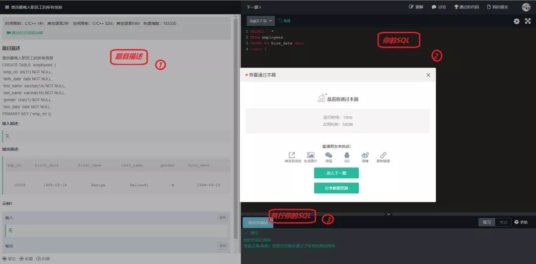 左边是题目,右边编辑 SQL, 点击【保存并调试】即可运行 SQL。系统会提示,你的答案是否通过!