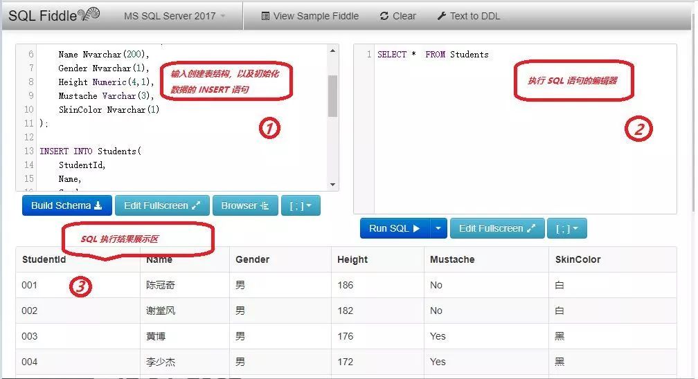 区域 1 的编辑器用来创建数据库 schema ,比如建表,新建数据;