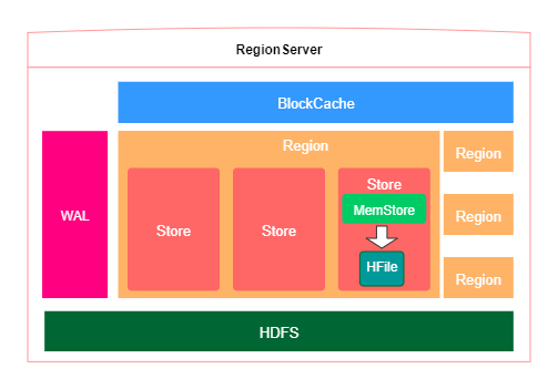 上一小节对HBase的整体架构进行了说明,接下来再看一下内部细节,如下图所示:展示了一台RegionServer的内部架构。