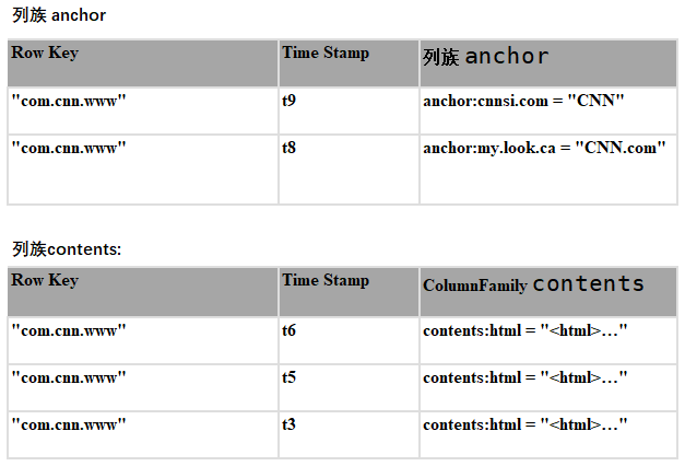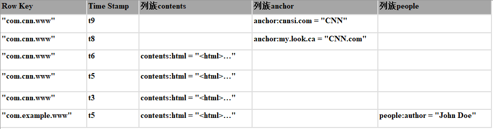 对于第一行数据(对应的row key为com.cnn.www),列族anchor包含两列:anchor:cssnsi.com和anchor:my.look.ca;列族contents包含一列:contents:html;