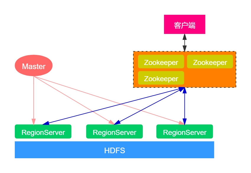 RegionServer非常依赖ZooKeeper服务,ZooKeeper在HBase中扮演的角色类似一个管家。ZooKeeper管理了HBase所有RegionServer的信息,包括具体的数据段存放在哪个RegionServer上。客户端每次与HBase连接,其实都是先与ZooKeeper通信,查询出哪个RegionServer需要连接,然后再连接RegionServer。