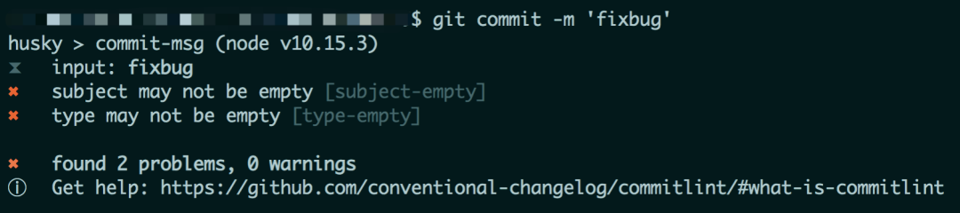 此刻开始,请使用 git cz 来替代 git commit 提交信息,我们来看看,假设我们随便写一个 git commit -m 'fixbug' 会提示什么?