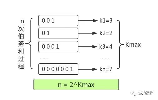 K是每回合抛到1所用的次数,我们已知的是最大的K值,用Kmax表示。由于每次抛硬币的结果只有0和1两种情况,因此,Kmax在任意回合出现的概率即为(½)Kmax ,进一步得出 N*(½)Kmax = 1 ,因此可以推测 N=2kmax 概率学把这种问题叫做伯努利实验。通过公式我们可以估算出 N = 2^6 = 64。