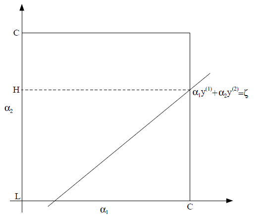 由于上面式子是一个标准的一元二次函数,所以很容易求解出最优值,从而可以得到的最优值,而这个最优值一定会在上图中这条线上,且在“方形约束”中。按照这种方式解除后,之后根据和的关系求解出,这样子就求解出了相对于和关于,且满足所有约束条件的最优值,该算法的关键是对一个一元二次函数求最优解,这个求解非常简单,这就使得SMO算法的内嵌计算非常高效。