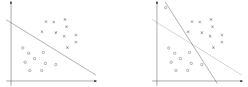 引入非负参数(松弛变量)过后,也就意味着允许某些样本的函数间隔小于1,甚至是负数,负数就代表样本点在对方区域中,如上方右边图的虚线作为超平面,一个空心圆点的函数间隔为负数。