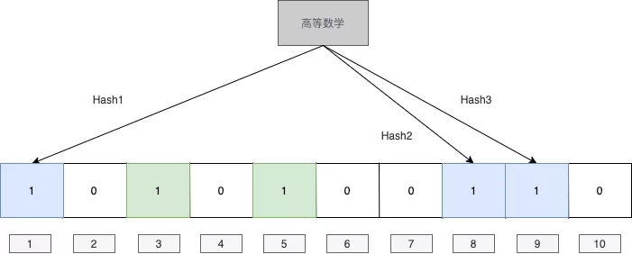 举个例子,假设我们一开始m是10,K是3。我们遇到第一个插入的值是”线性代数“,我们对它hash之后得到1,3,5,那么我们将对应的位置标记成1.