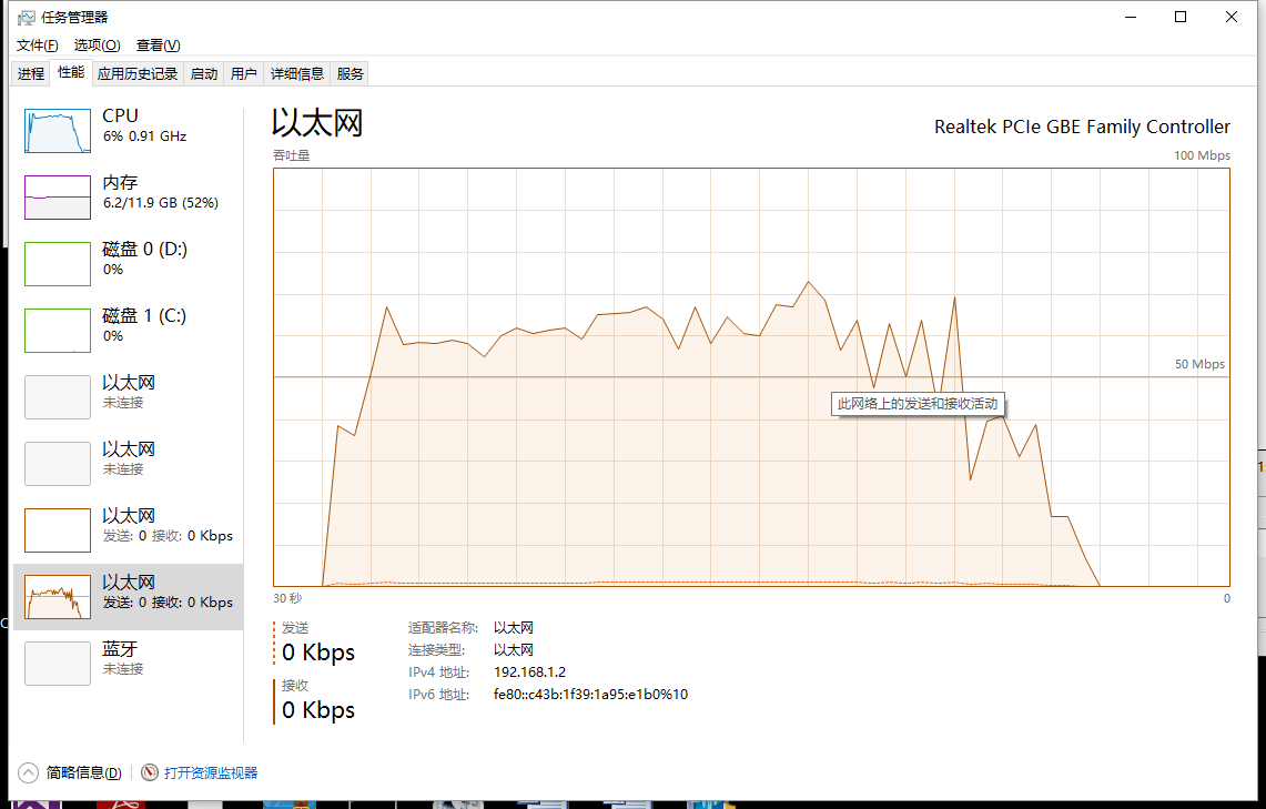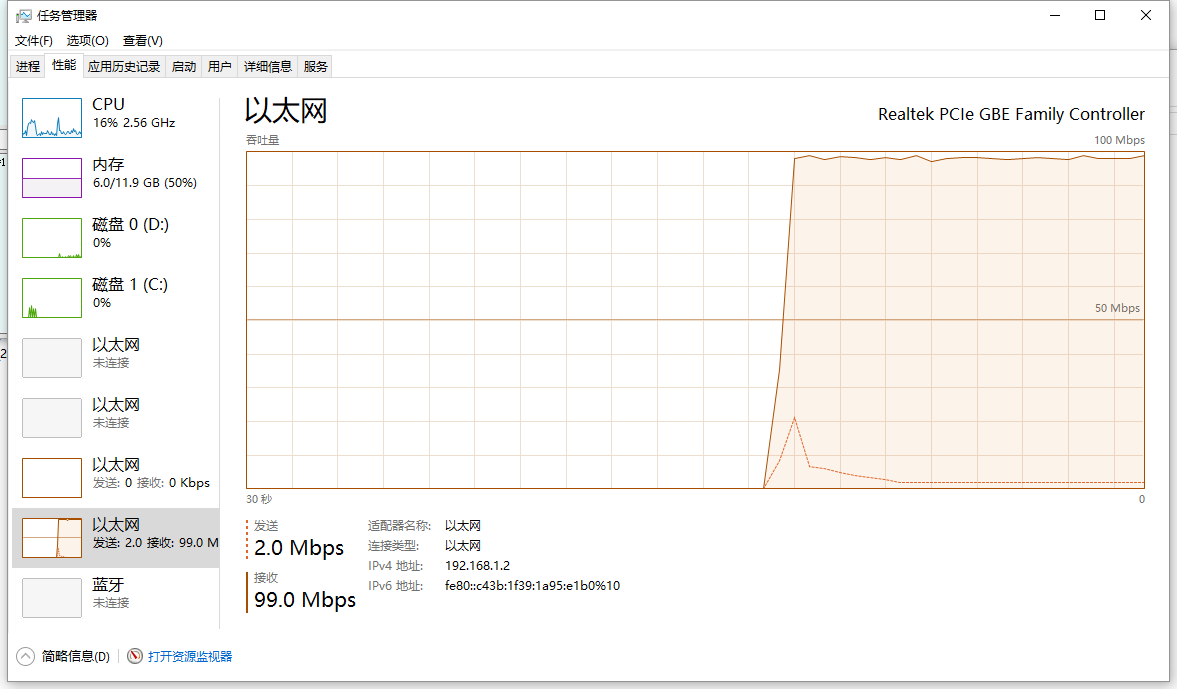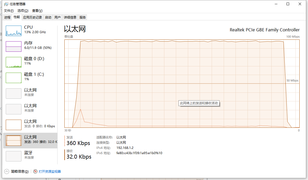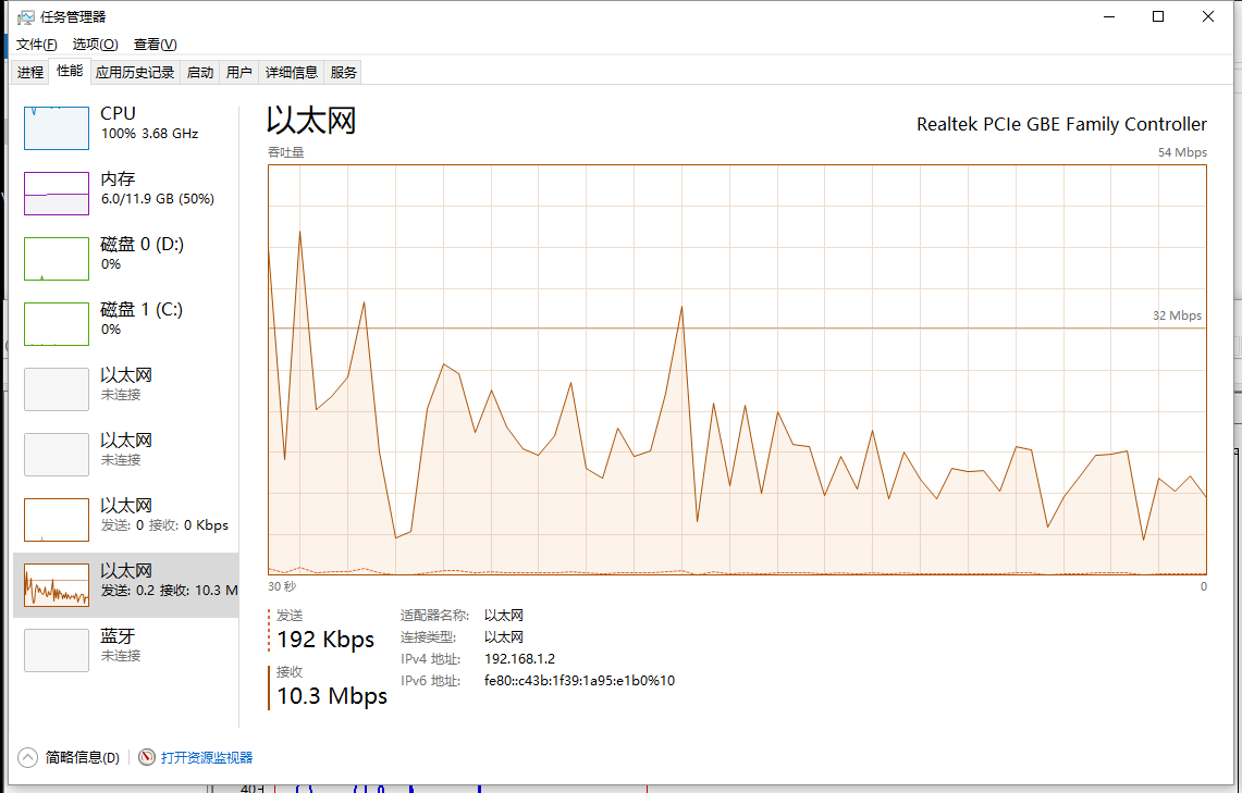先直接看管道式的表现:(截图全部为windows自带任务管理器及资源管理器)