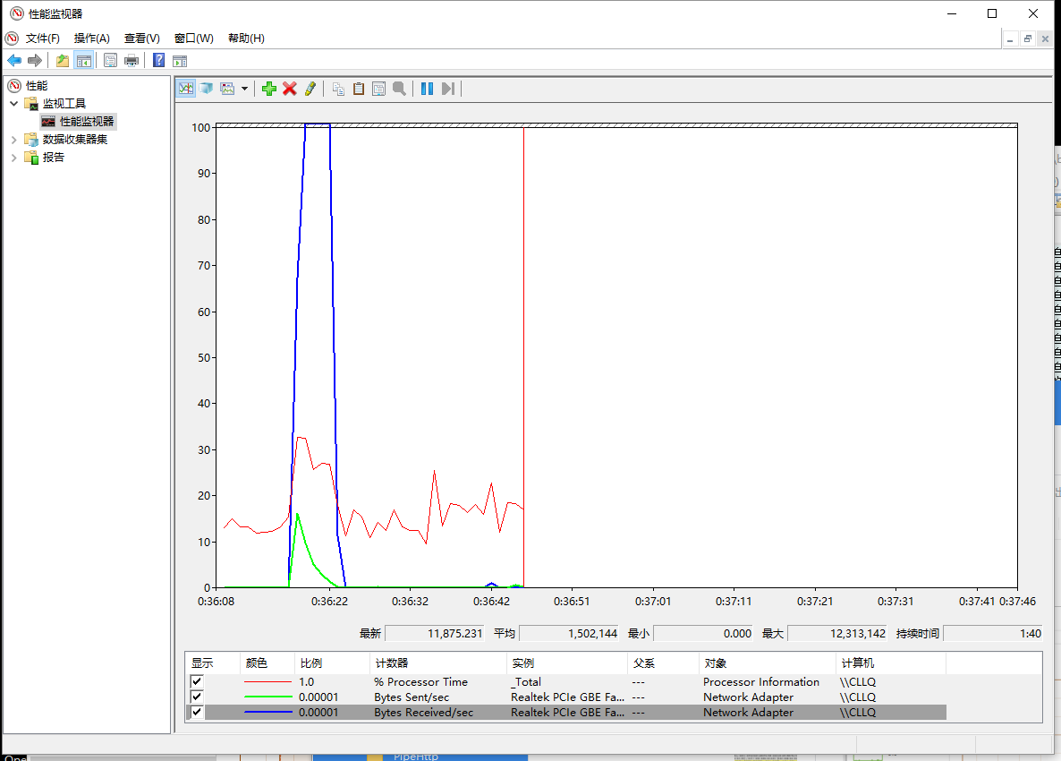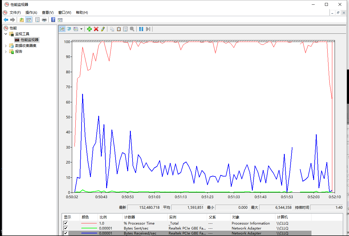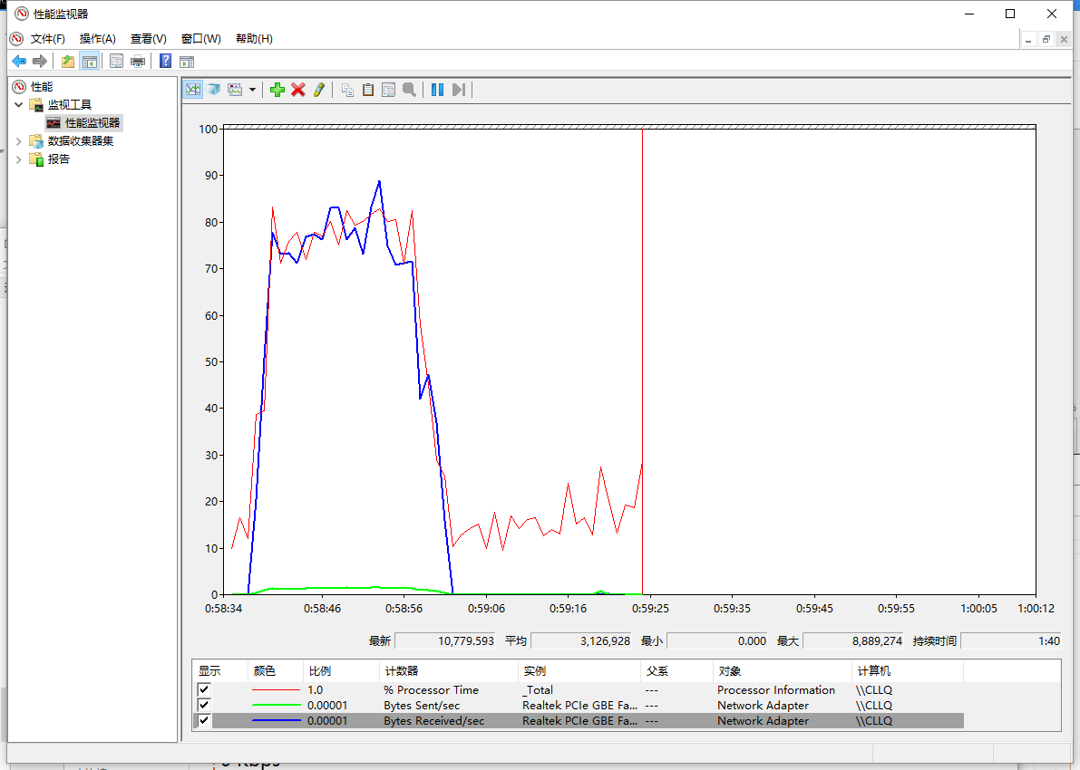 第二副为资源管理器,添加了3个采样器,红色为CPU占用率,蓝色为网络接收速率,绿色为网络发送速率。