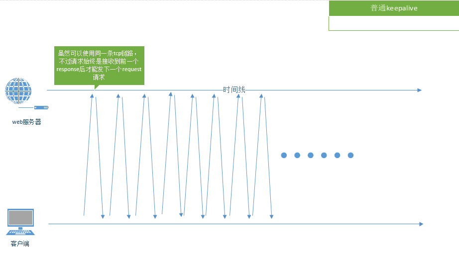 而普通的keepalive的模式如上图,一条线代表一个请求,不仅一次只能发送一个,而且必须等待回复后才能发下一个。