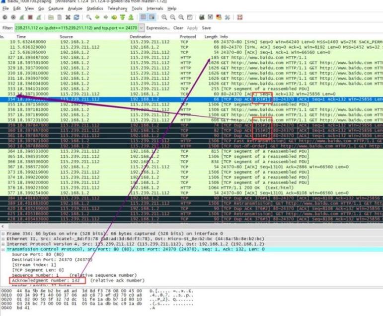 其实就是说服务器没有发现下一个包后面又发了3次(一共4次·)TCP DUP ACK 都是针对353的,所以后面客户端很快就重传了TCP DUP ACK 所指定的丢失的包(即下面看到的362)