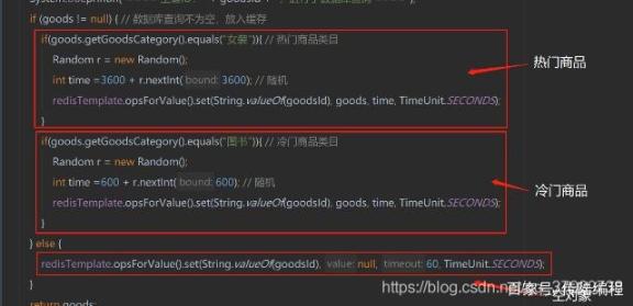 (1)采取不同分类商品,缓存不同周期。在同一分类中的商品,加上一个随机因子。这样能尽可能分散缓存过期时间,而且,热门类目的商品缓存时间长一些,冷门类目的商品缓存时间短一些,也能节省缓存服务的资源。