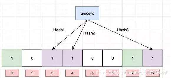 布隆过滤器是一个bit向量或者bit,如果我们要映射一个值到布隆过滤器中,我们使用多个不同的哈希函数生成多个哈希值,并将每个生成的哈希值指向的bit位设置为1,如下baidu一词设置了三个位置为1。