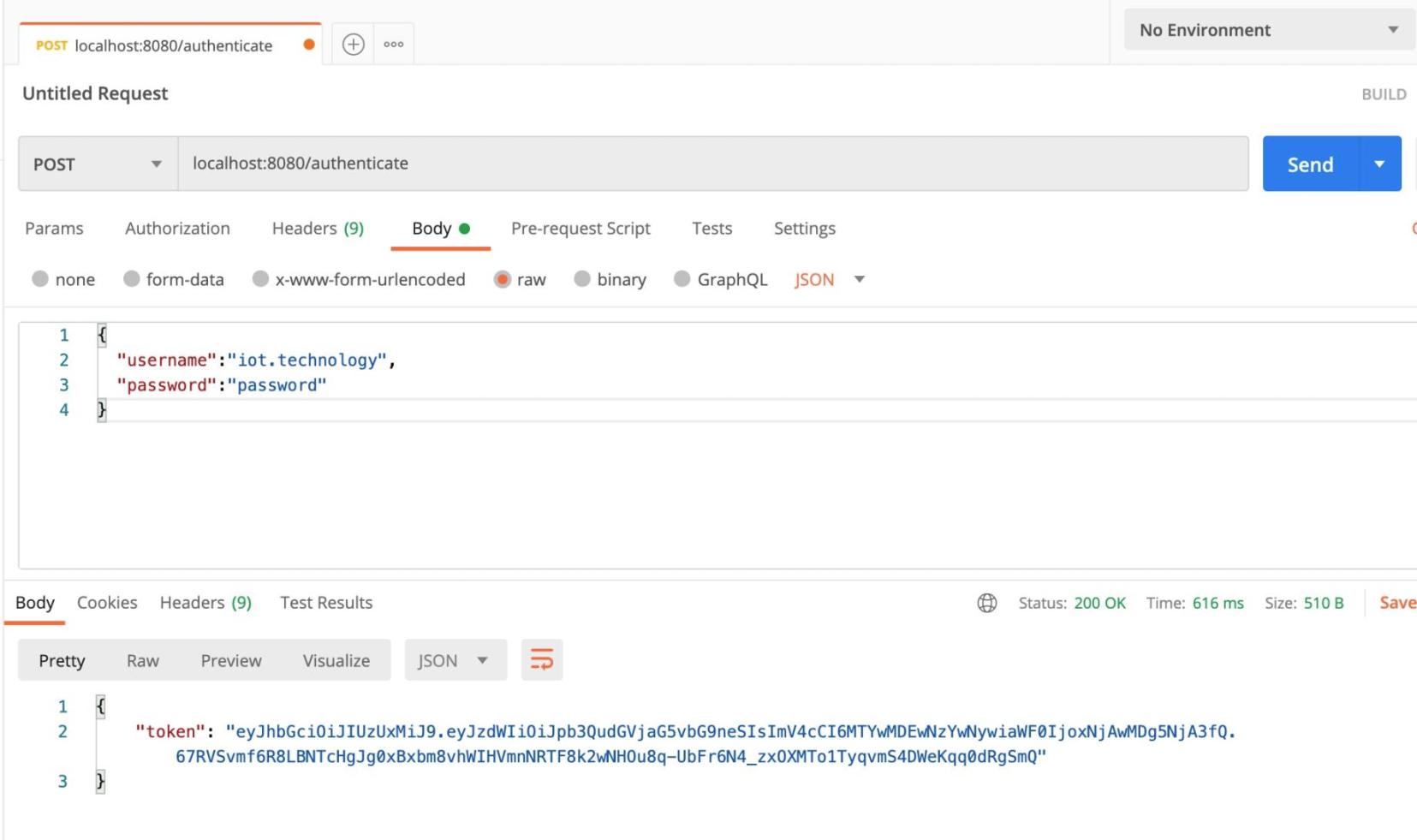 使用Url localhost:8080/authenticate创建POST请求。正文应具有有效的用户名和密码。在我们的情况下,用户名是: iot.technology, 密码是: password。