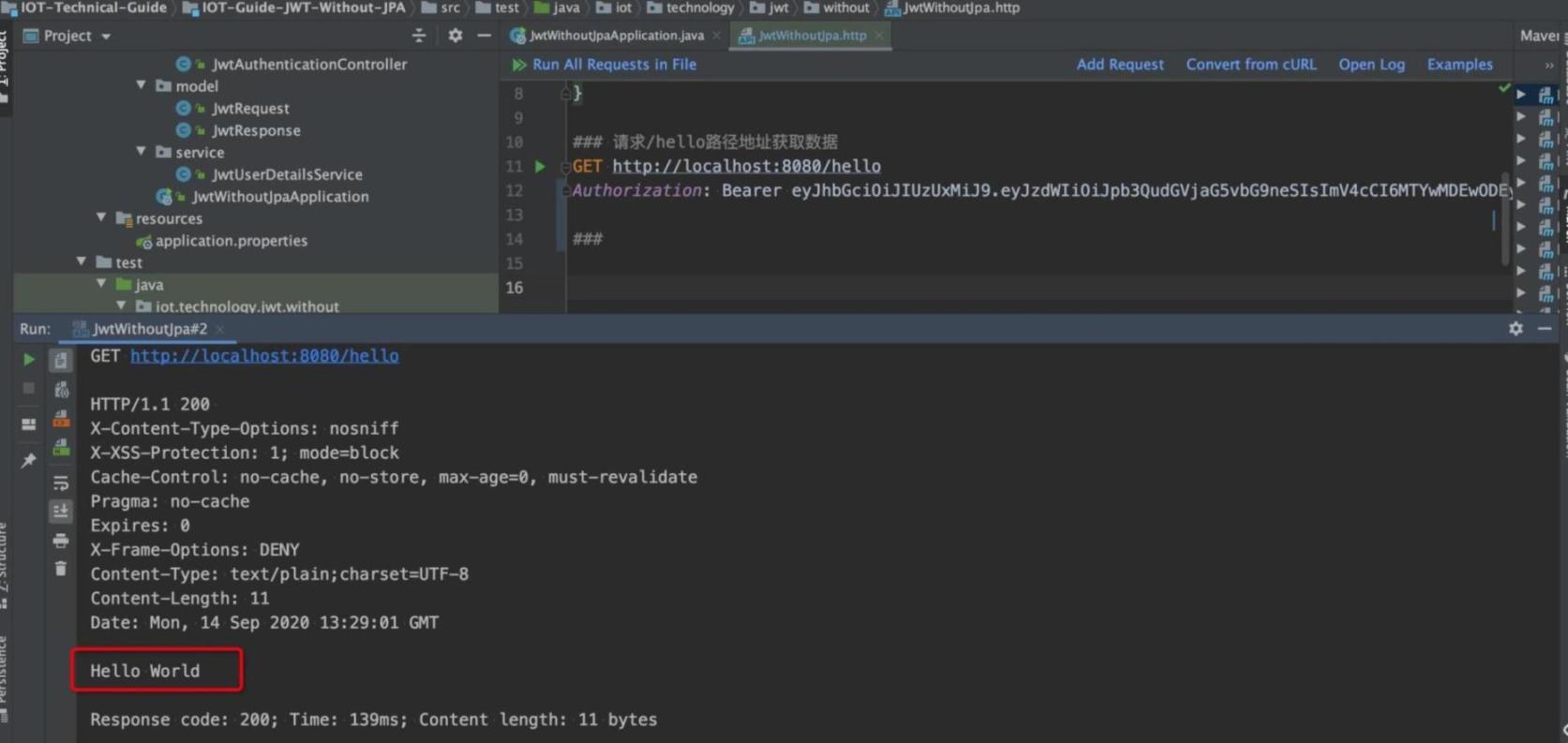 编译并将JwtWithoutJpaApplication.java作为Java应用程序运行。在网页输入localhost:8080/hello。