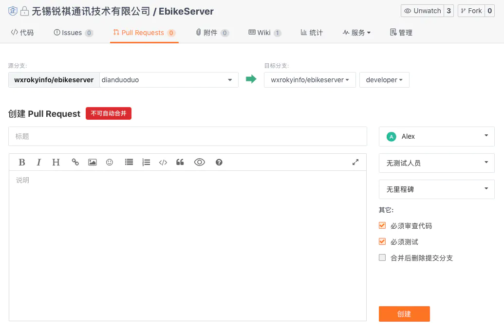 - 发起Pull Request以后,请将Pull Request的链接通过Email发给代码审核者,以此通知对方及时进行审核。(BUG修复类当日必须完成合并或者拒绝,功能类或者觉得有重大调整需要会议Review必须在邮件中明确时间和会议人员)