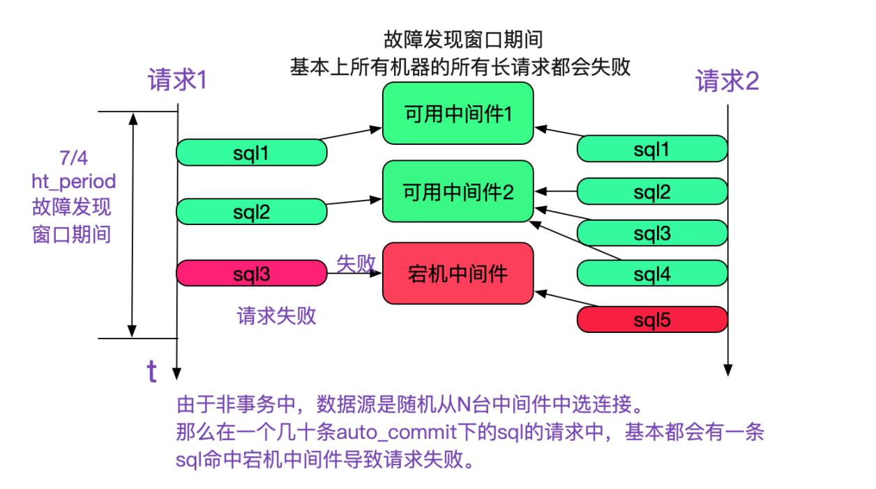 如上图所示,在故障发现窗口期中(即还没有确定某台中间件不可用时),数据源是随机选择连接的。而这个连接就有一定1/N(N为中间件个数)的概率命中不可用中间件导致一条sql失败进而导致整个请求失败。我们做一个计算: