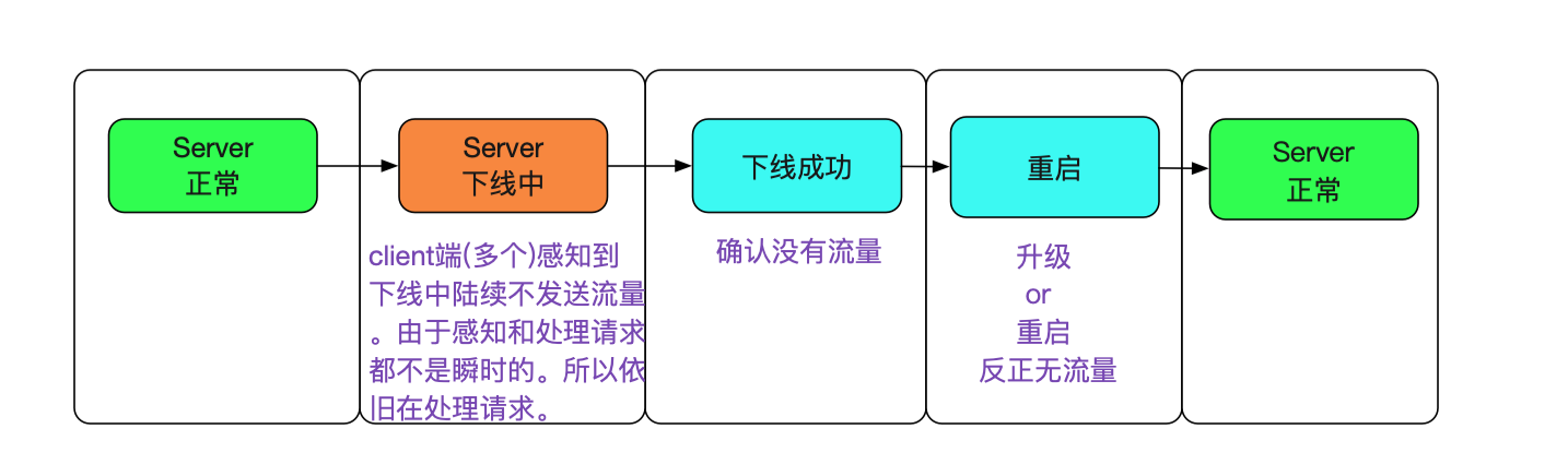 在笔者所知的很多做法中,让client端感知下线是引入一个第三方协调者(例如zookeeper/etcd)。而我们并不想引入第三方的组件去做这个操作,因为这又会引入zookeeper的高可用问题,而且会让client端的配置更加复杂。平滑无损的大致思路(状态机)如下图所示: