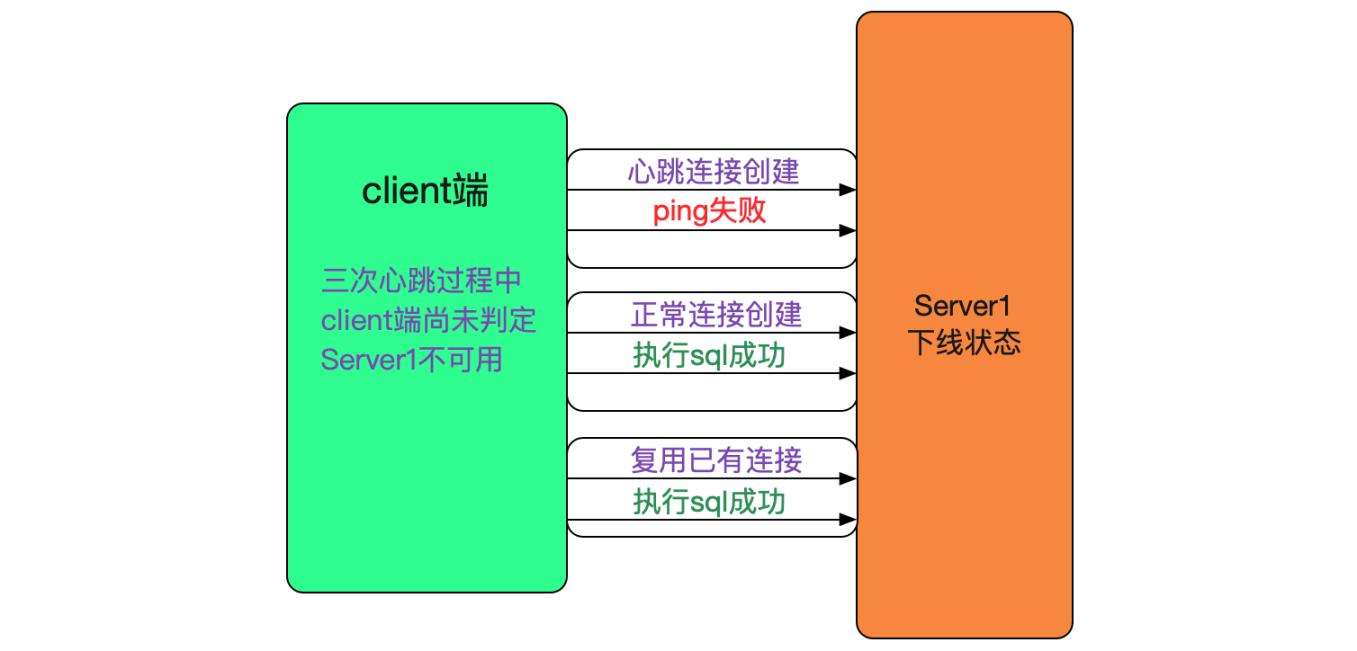 三次心跳失败后,client端判定Server1失败,需要将连接到server1的连接销毁。其思路是,业务层用完连接返回连接池的时候,直接给close掉(当然这个是简单的描述,实际操作到Druid数据源也是有细微的差别的)。