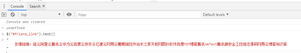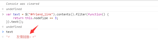 如上图,要想获取这里的 友情链接几个大字,直接用 text() 肯定是不行的,默认情况它会将所有的子节点的文本也会抓到,如下图: