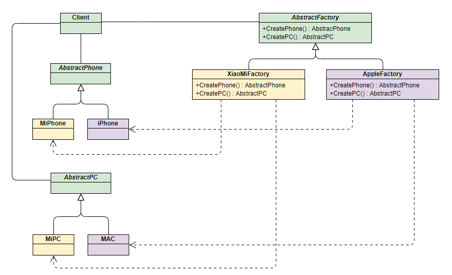 最简单的方式是把2中介绍的工厂方法模式完全复制一份,不过这次生产的是PC。但同时也就意味着我们要完全复制和修改Phone生产管理的所有代码,显然这是一个笨办法,并不利于扩展和维护。