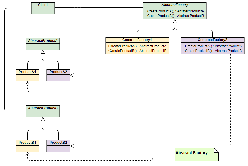 为了弄清楚上面的结构,我们使用具体的产品和工厂来表示上面的UML类图,能更加清晰的看出模式是如何演变的: