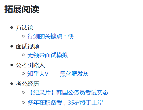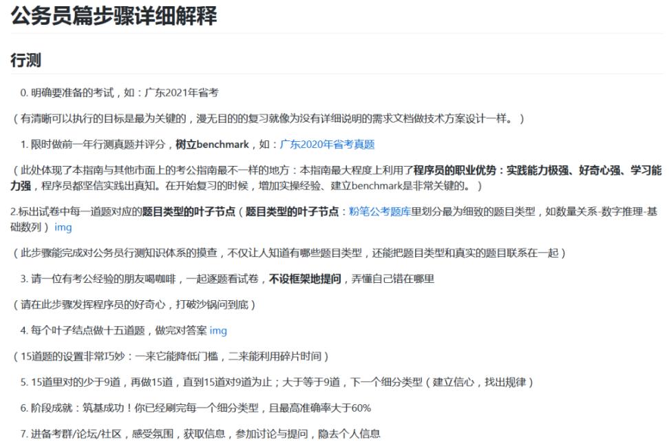 此外,在最佳实践部分,作者对公务员考试的行测、申论和面试做了详尽的经验分享。从做题的技巧,到面试的穿着打扮,甚至还有作者身体锻炼计划等一应俱全,不得不佩服这份指南太细致。