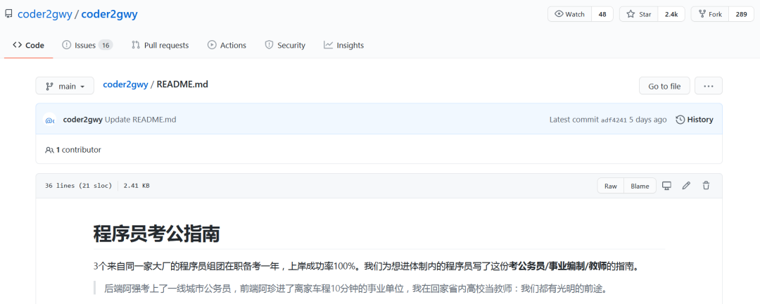 近日,在GitHub上,一份程序员考公指南冲上热榜,几天时间不到,被标星2.4k,累计分支有289个。