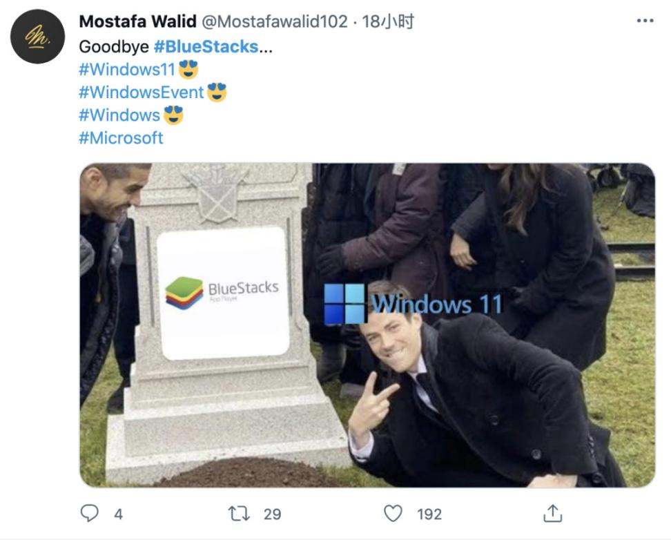 面对操作系统级别的降维打击,twitter上出现了著名模拟器BlueStacks爆了粗口(现在去看没有看到这条,不知道是删除了还是伪造)