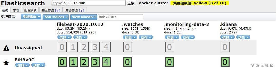 我们运行所有的组件之后,首先看下 elasticsearch-head 中的索引变化: