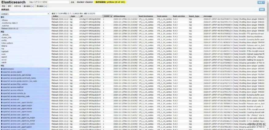可以看到多了一个 filebeat-2020.10.12 的索引,说明 ELKB 分布式日志收集框架搭建成功。访问 http://localhost:9100,我们来具体看下索引的数据: