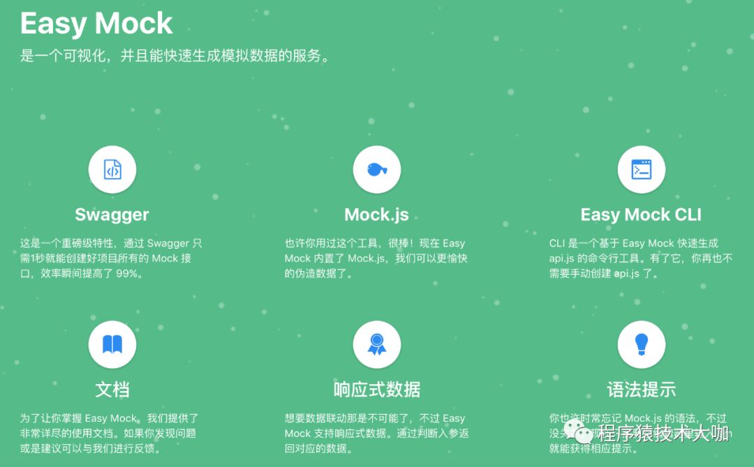 官网的这张图基本上介绍清楚了easymock的核心功能,这其中我最看重的功能有两块,一个是能够集成swagger接口并集中管理所有接口,另一个就是响应式数据。