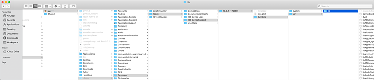 我们每次真机连接 Xcode 运行程序,会提示等待,其实系统为了堆栈解析,都会把当前版本的系统符号库自动导入到 /Users/你自己的用户名/Library/Developer/Xcode/iOS DeviceSupport 目录下安装了一大堆系统库的符号化文件。你可以访问下面目录看看