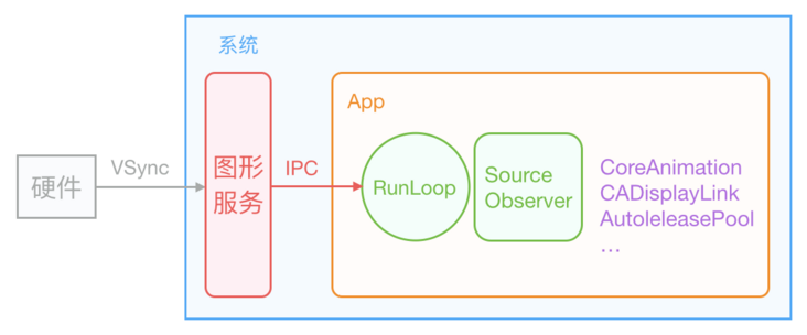VSync 信号到来后,系统图形服务会通过 CADisplayLink 等机制通知 App,App 主线程开始在 CPU 中计算显示内容(视图创建、布局计算、图片解码、文本绘制等)。然后将计算的内容提交到 GPU,GPU 经过图层的变换、合成、渲染,随后 GPU 把渲染结果提交到帧缓冲区,等待下一次 VSync 信号到来再显示之前渲染好的结果。在垂直同步机制的情况下,如果在一个 VSync 时间周期内,CPU 或者 GPU 没有完成内容的提交,就会造成该帧的丢弃,等待下一次机会再显示,这时候屏幕上还是之前渲染的图像,所以这就是 CPU、GPU 层面界面卡顿的原因。