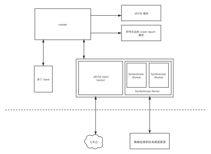 简单说明下,符号化流程是一个主从模式,一台 master 机,多个 slave 机,master 机读取 .DSYM 和 crash 结果的 cache。「数据处理和任务调度框架」调度符号化服务(内部2个 symbolocate worker)同时从七牛云上获取 .DSYM 文件。
