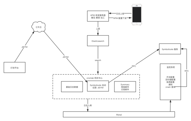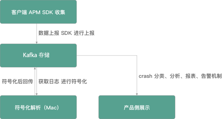 所以整个流程就是:客户端 APM SDK 收集 crash log -> Kafka 存储 -> Mac 机执行定时任务符号化 -> 数据回传 Kafka -> 产品侧(显示端)对数据进行分类、报表、报警等操作。