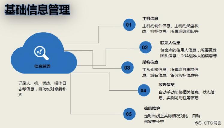 京东业务每年都在以爆发的形式在增长,数据库服务器的数量众多,产品线也多达上千条,要支持如此庞大的业务体系,需要一套完善的运维自动化管理平台。目前京东MySQL数据库管理平台简称DBS,主要涵盖以下内容:完善的资产管理系统、数据库流程管理系统、数据库监控系统、数据库故障管理系统、数据库报表系统、弹性数据库系统以及数据库辅助运维工具,涉及DBA运维的方方面面,实现了DBA对MySQL的自动化、自助化、可视化、智能化、服务化管理,避免DBA因手工操作失误带来的生产事故,保障京东数据库的安全、稳定、高效运行。这里着重介绍以下部分核心功能组件。