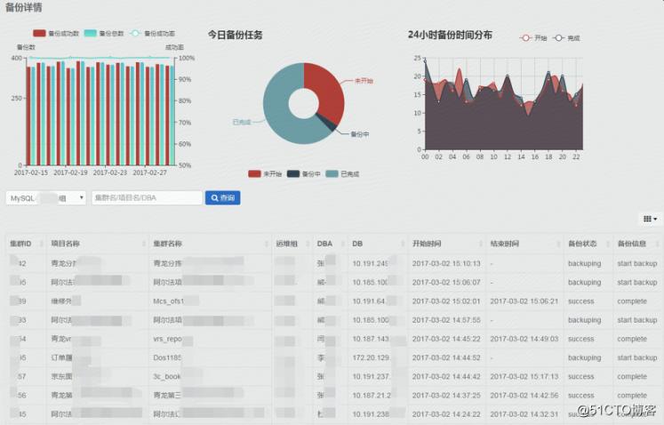 备份详情里面展示了最近备份总数,成功数,成功率,当天备份任务运行状态,备份任务24小时分布曲线图以及备份详细记录。备份详细的记录可以根据集群名、项目名等信息进行查询,方便DBA更好地掌握备份运行状况。
