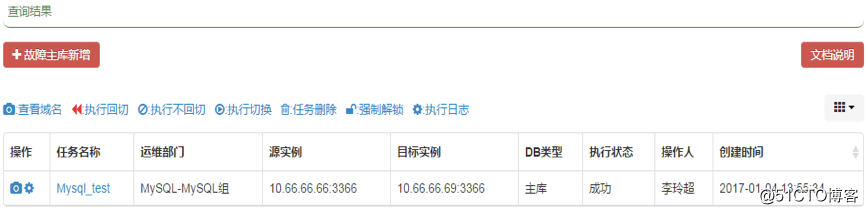 监控系统会自动创建任务,并根据先本地后异地原则,然后再查连接数,QPS,确定目标实例为10.88.88.88:3366,进行自动切换,DBA可在切换任务列表查看详情。