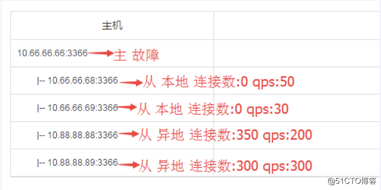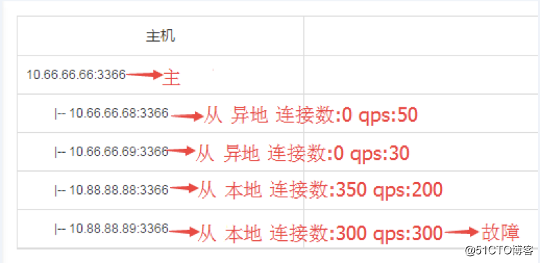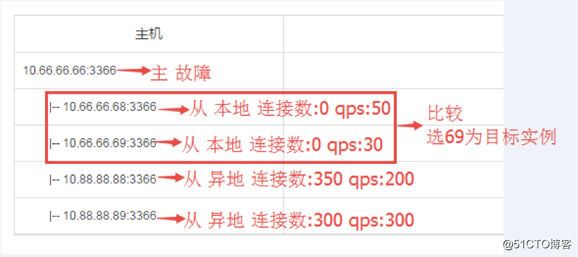 2.选目标实例,假如例子中的4个从都是存活的,那么根据先本地后异地原则,选出10.66.66.68:3366,10.66.66.69:3366,然后再去查连接数,在连接数都相同的情况下,则去比较QPS,选出QPS负载低的10.66.66.69:3366作为目标实例。