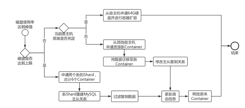 针对递增资源:磁盘,在业务接入之初,统一分配64G的硬盘,每当当前磁盘使用率达到80%,且没有达到256G上限的时候,则进行垂直升级;若容器当前磁盘达到了256G上限则进行在线Resharding。