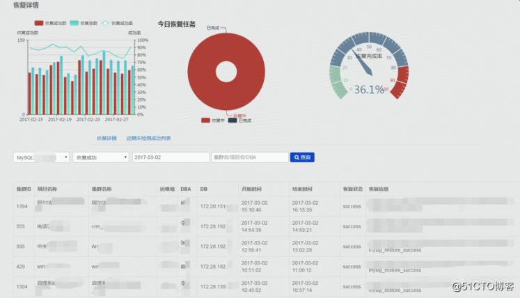 恢复检测页面包含最近每天恢复检测数,恢复检测成功数,成功率柱状图,当天恢复检测任务运行状态饼图和近期恢复检测完成率,有助于DBA对恢复概况有更清晰的了解。
