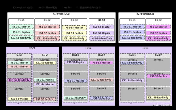 每个KeySpace都有一个主机房,属于同一个Shard中的数据库实例(目前一个shard中包含1主2从)的资源分配尽量应该满足:Master必须属于主机房,不能有任意两个实例属于同一机架,不能有任意三个实例在同一IDC,这种策略可以避免某一机柜掉电而导致主从同时出现故障,也可以避免IDC故障从而导致所有数据库实例均不可用。