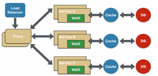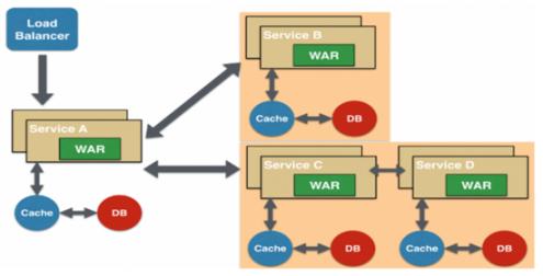 所有的功能打包在一个 WAR包里,基本没有外部依赖(除了容器),部署在一个JEE容器(Tomcat,JBoss,WebLogic)里,包含了 DO/DAO,Service,UI等所有逻辑。