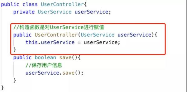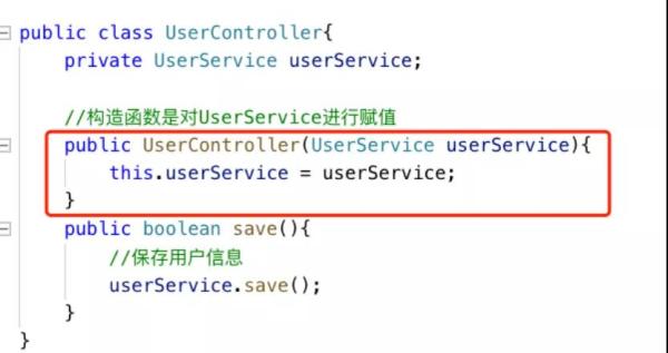 这里的含义是在 UserController 的构造函数中会引入 UserService,从而说明两者之间的依赖关系,也就是 UserController 会依赖 UserService。
